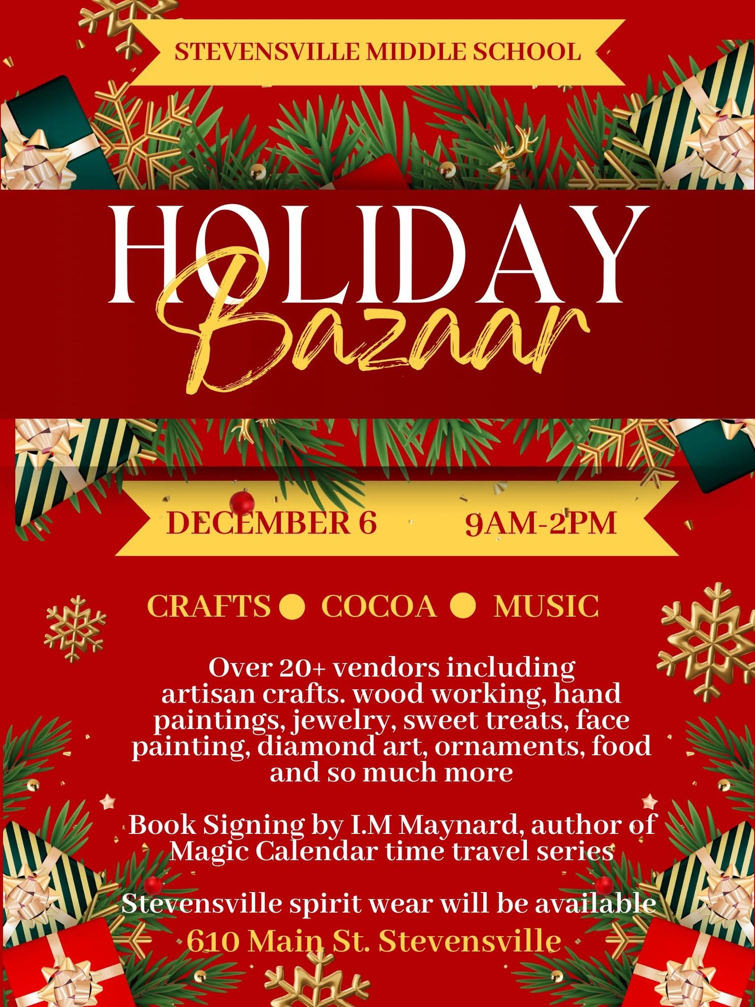 Upcoming Events « All Events Christmas Bazaar December 6 @ 9:00 am - 2:00 pm Free « Agatha Christie’s Murder on the Orient Express Studio Tour » Christmas Bazaar held at Stevensville Middle School Add to calendar Google Calendar iCalendar Outlook 365 Outlook Live Details Date: December 6 Time: 9:00 am - 2:00 pm Cost: Free Event Category: Festivals Related Events Historic Stevensville Holiday Lights Annual Tree Lighting December 6 @ 4:30 pm - 6:00 pm