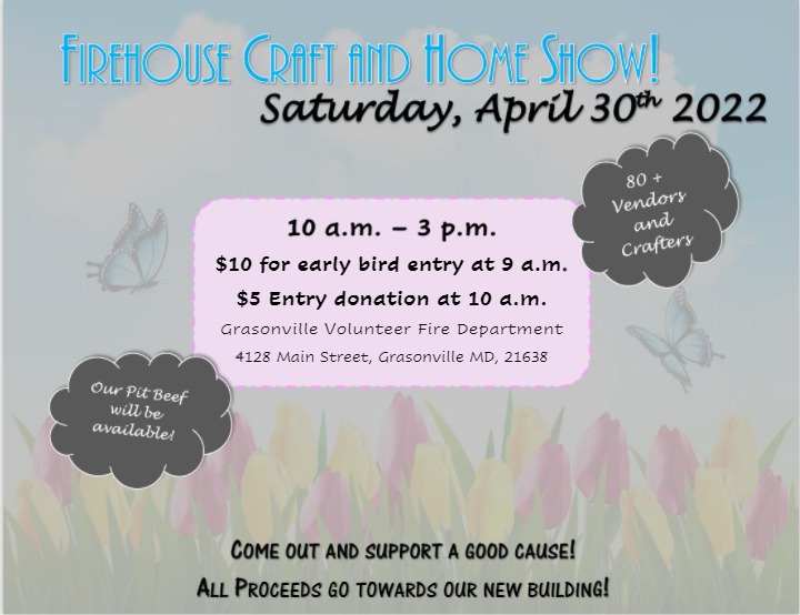 The Grasonville Volunteer Fire Department is hosting a “Firehouse Craft and Home Show” Saturday April 30th. A huge home and craft show with over 80 vendors/crafters on site with vendors inside and outside. A $5 donation for general admission entering at 10 am. A $10 donation for “early bird” admission lets you enter at 9 am.