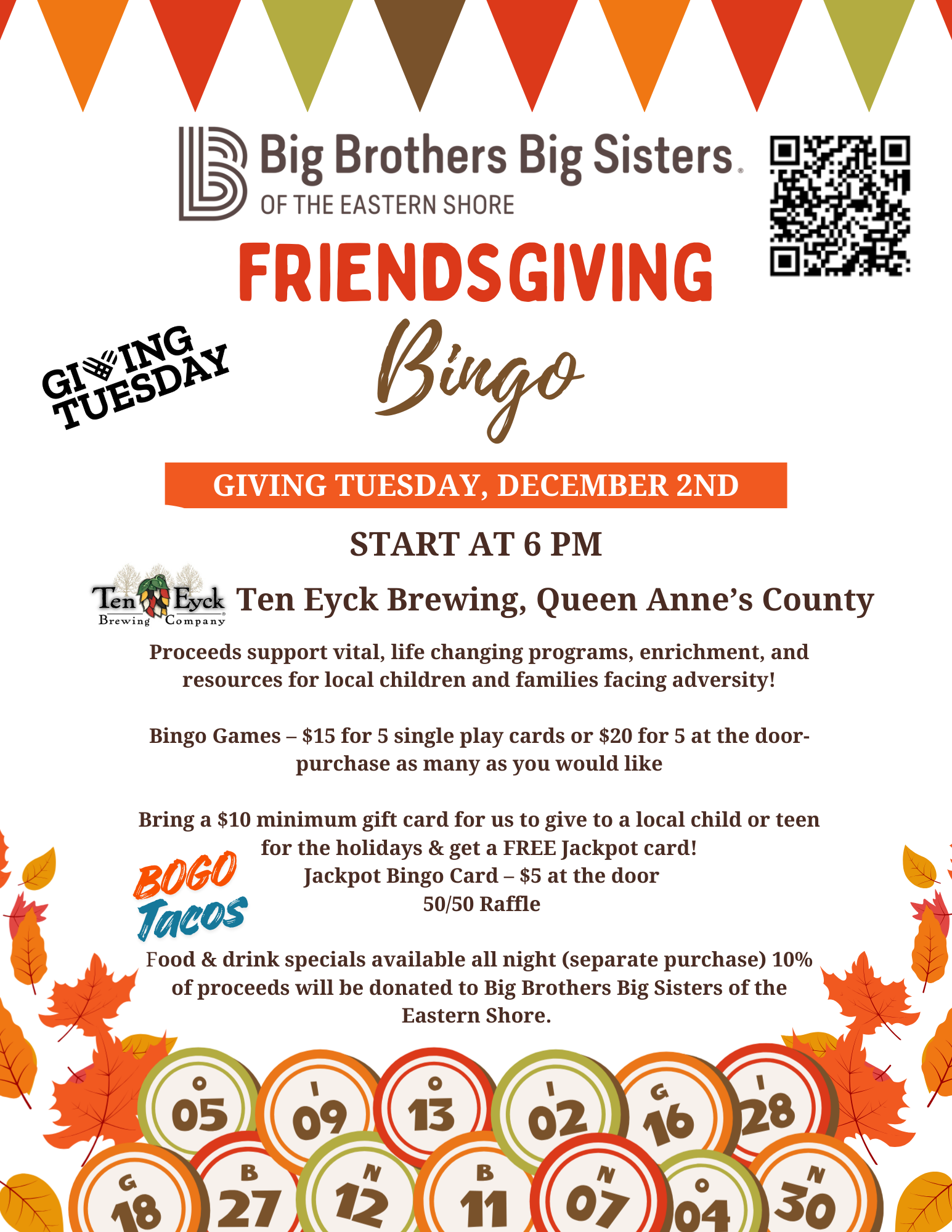 Big Brothers Big Sisters of the Eastern Shore (BBBSES) is bringing the warmth of the season to Queen Anne’s County with a special Giving Tuesday celebration: FriendsGiving Bingo.