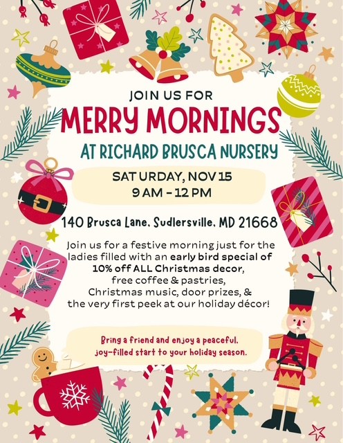 All ladies are invited to join us for Merry Mornings at Richard Brusca Nursery, Inc. this Saturday, November 15 from 9am-12pm. Join us for a festive morning just for the ladies filled with an early bird special of 10% off all Christmas decor. free coffee, hot cocoa, chai tea,