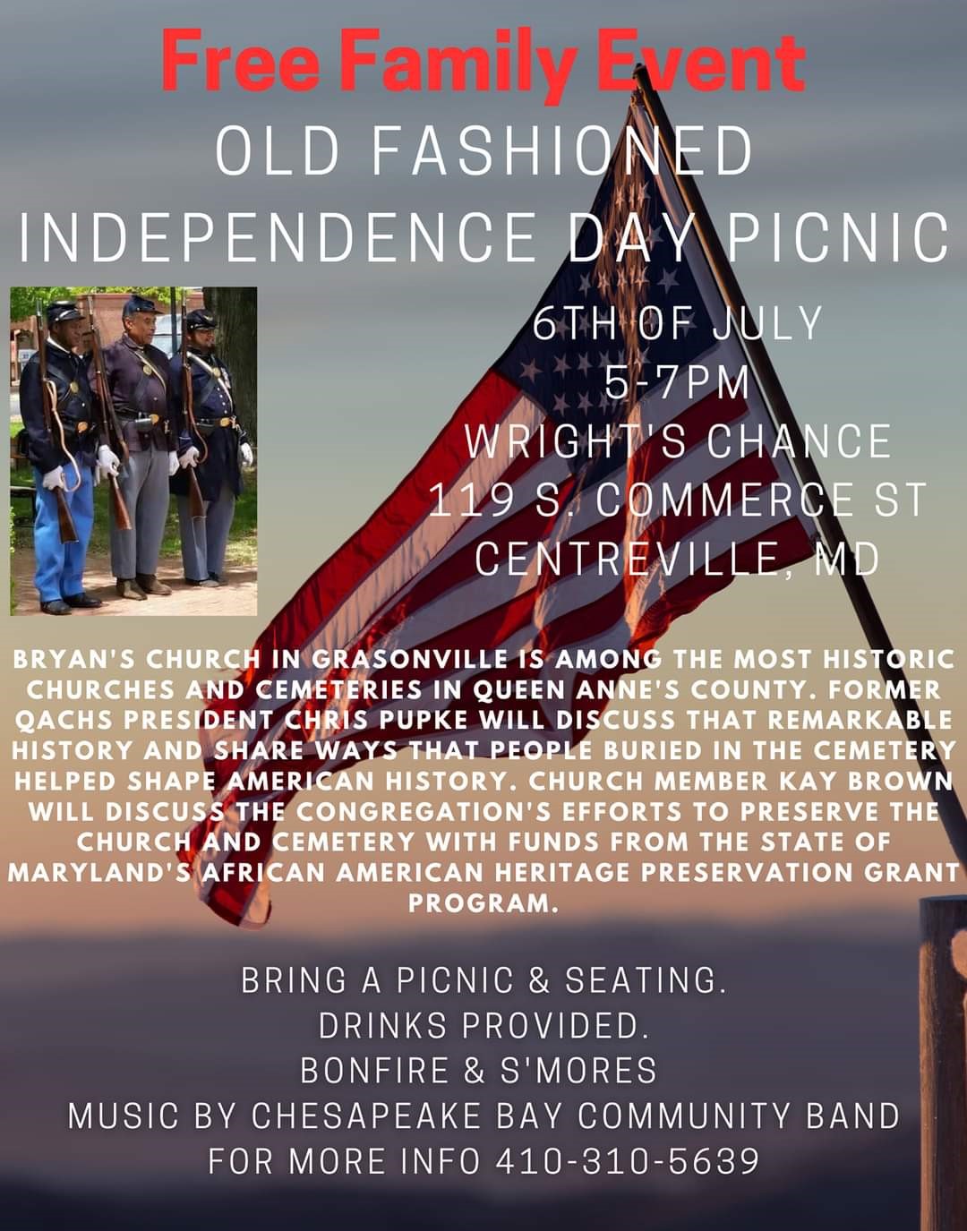 We will have a guest speaker, Chris Pupke, a big band, free drinks, a bonfire and s’mores! Guests are asked to bring their own picnic, blankets and chairs.