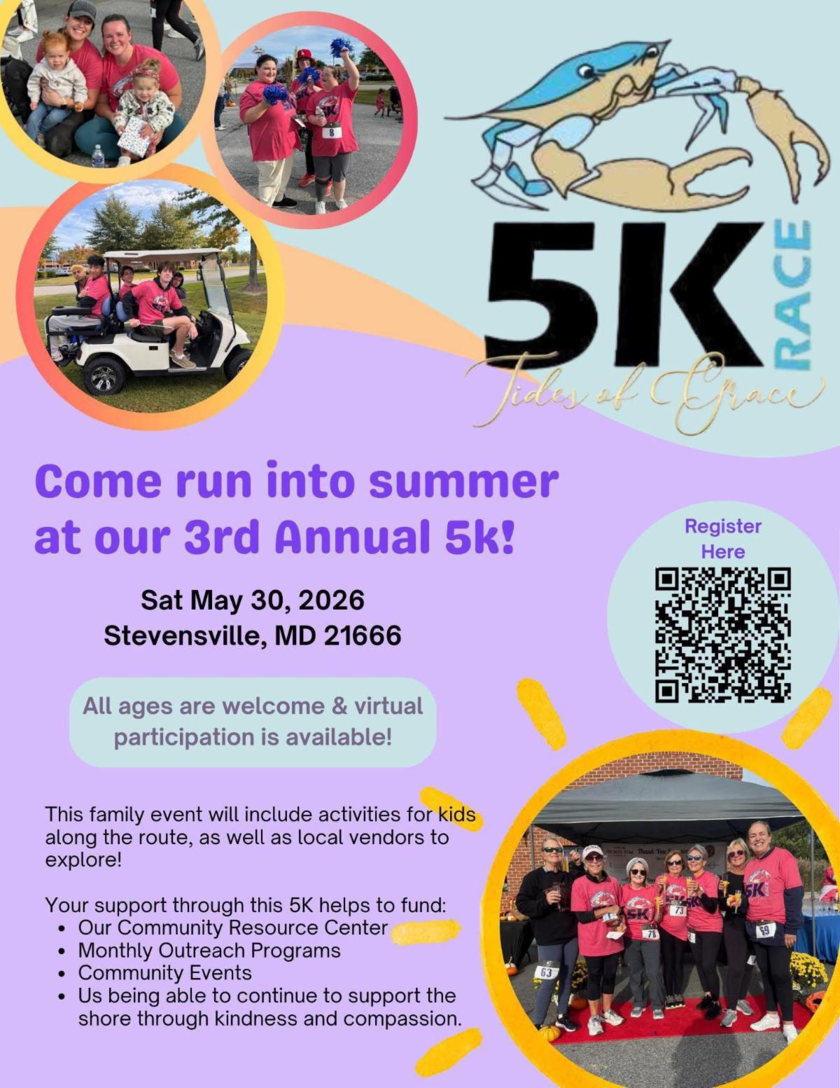 Join us on Saturday, May 30, 2026 for our 3rd Annual Tides of Grace 5K: Run Into Summer right here in Stevensville.