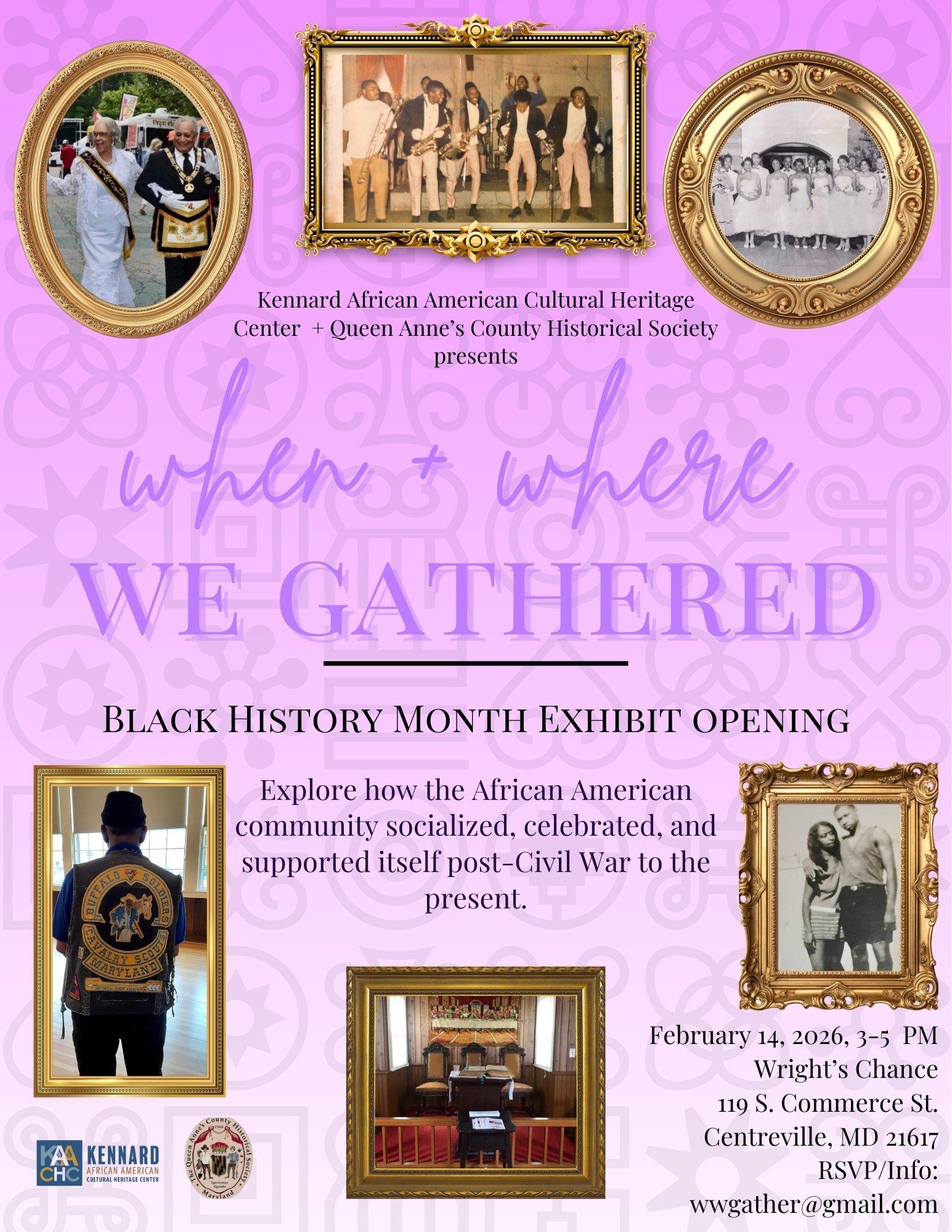 Centreville, MD — The Kennard African American Cultural Heritage Center (KAACHC), in partnership with the Queen Anne’s County Historical Society, will open a new Black History Month exhibition, When & Where We Gathered, on Saturday, February 14, 2026, from 3:00–5:00 p.m. at Wright’s Chance Museum House, located at 119 S. Commerce Street, Centreville.