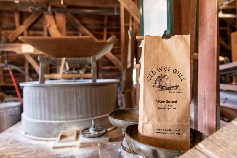 Old Wye Mill was one mill important to putting the Eastern Shore on the map as a center of the Breadbasket of the Revolution. It was among many mills scattered throughout Queen Anne’s County and beyond, operations bordering streams and rivers that produced everyday needs such as flour, livestock feed, cloth, lumber, and gunpowder. A Maryland Historical Trust survey reports that the town of Wye Mills was so named because of three mills operating along the Wye River. Of the three, only Old Wye Mill remains. Now the oldest continuously operated water-powered grist (grain) mill in the United States, Old Wye Mill still grinds wheat on or near the site where the original structure was built in 1682. According to a 2021 study of structural timbers, the current building was likely reconstructed in 1753.
