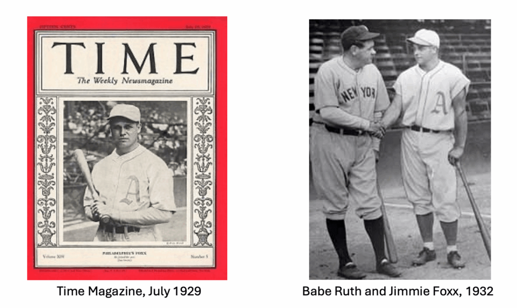 Before the season ended, Foxx attracted the attention of the Yankees and the Athletics. He signed with Philadelphia, hitting his first major league baseball home run three years later. In 1929, as the Athletics’ first baseman, Foxx hit 33 home runs, helping the team win the World Series on October 14. Earlier in the year, in July, Foxx made the cover of Time magazine. The town of Sudlersville held a banquet honoring their hometown hero. Connie Mack, owner of the Athletics, and “Home Run” Baker, along with teammates, joined the celebration.