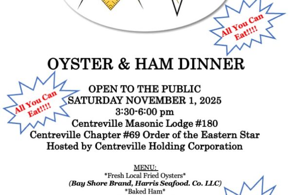 OYSTER & HAM DINNER OPEN TO THE PUBLIC SATURDAY NOVEMBER 1, 2025 3:30-6:00 pm Centreville Masonic Lodge #180 Centreville Chapter #69 Order of the...